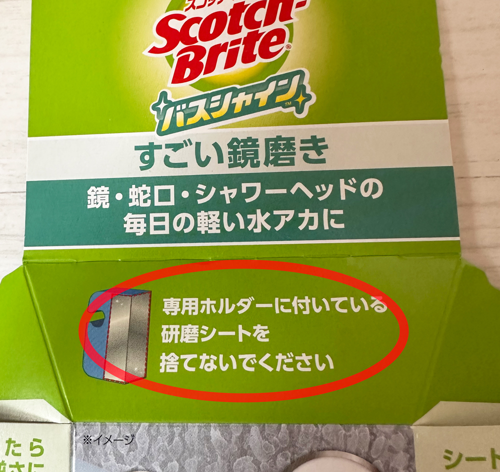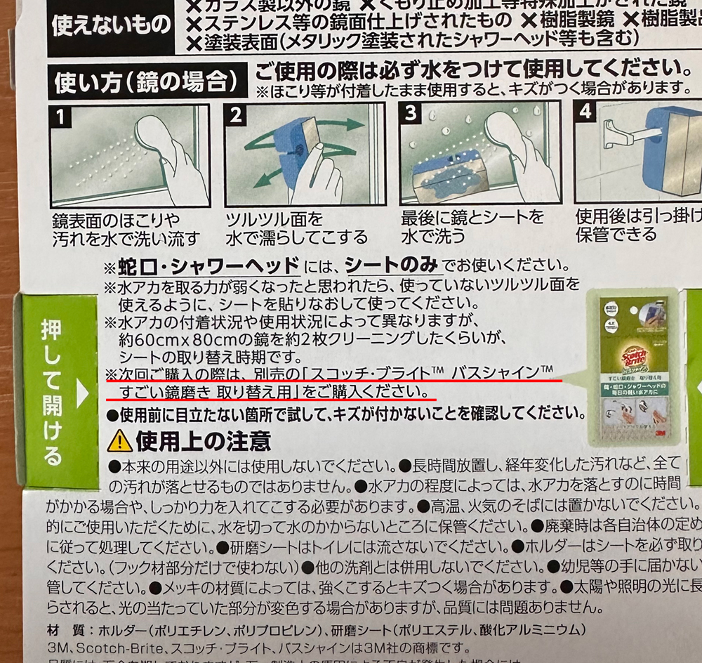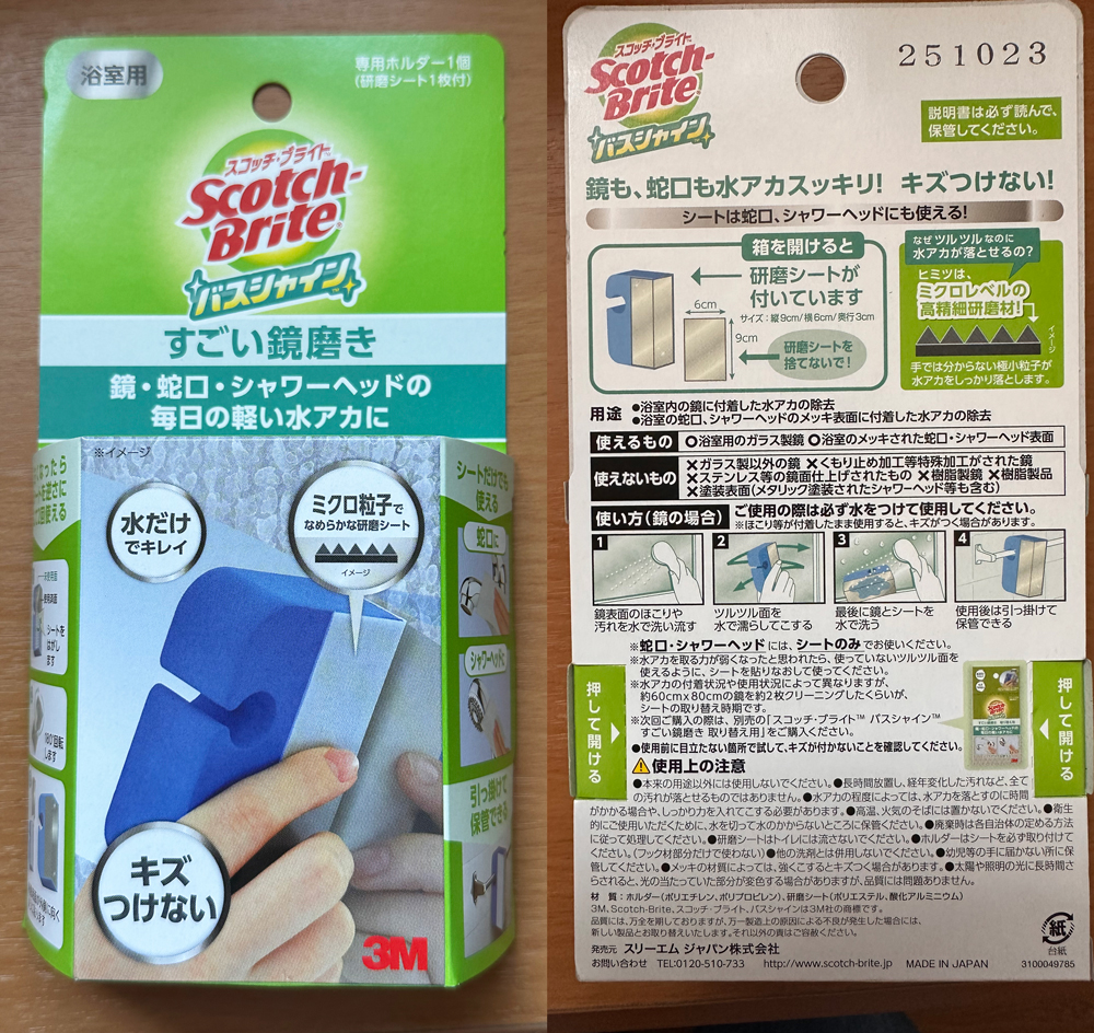 この頑固な汚れを落とすために買ってきたのがこちら! 3M(スリーエム)さんの「スコッチ・ブライト バスシャイン すごい鏡磨き」です。