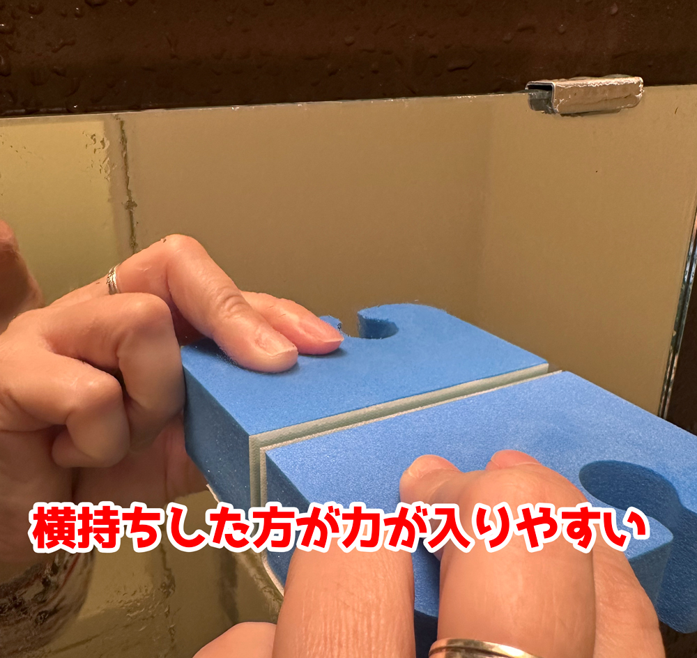 擦り始めは、鏡のウロコ汚れに「ジャリジャリ」「ザラザラ」と引っかかる感触があります。 それをひたすら、ゴシゴシ、ゴシゴシ…。